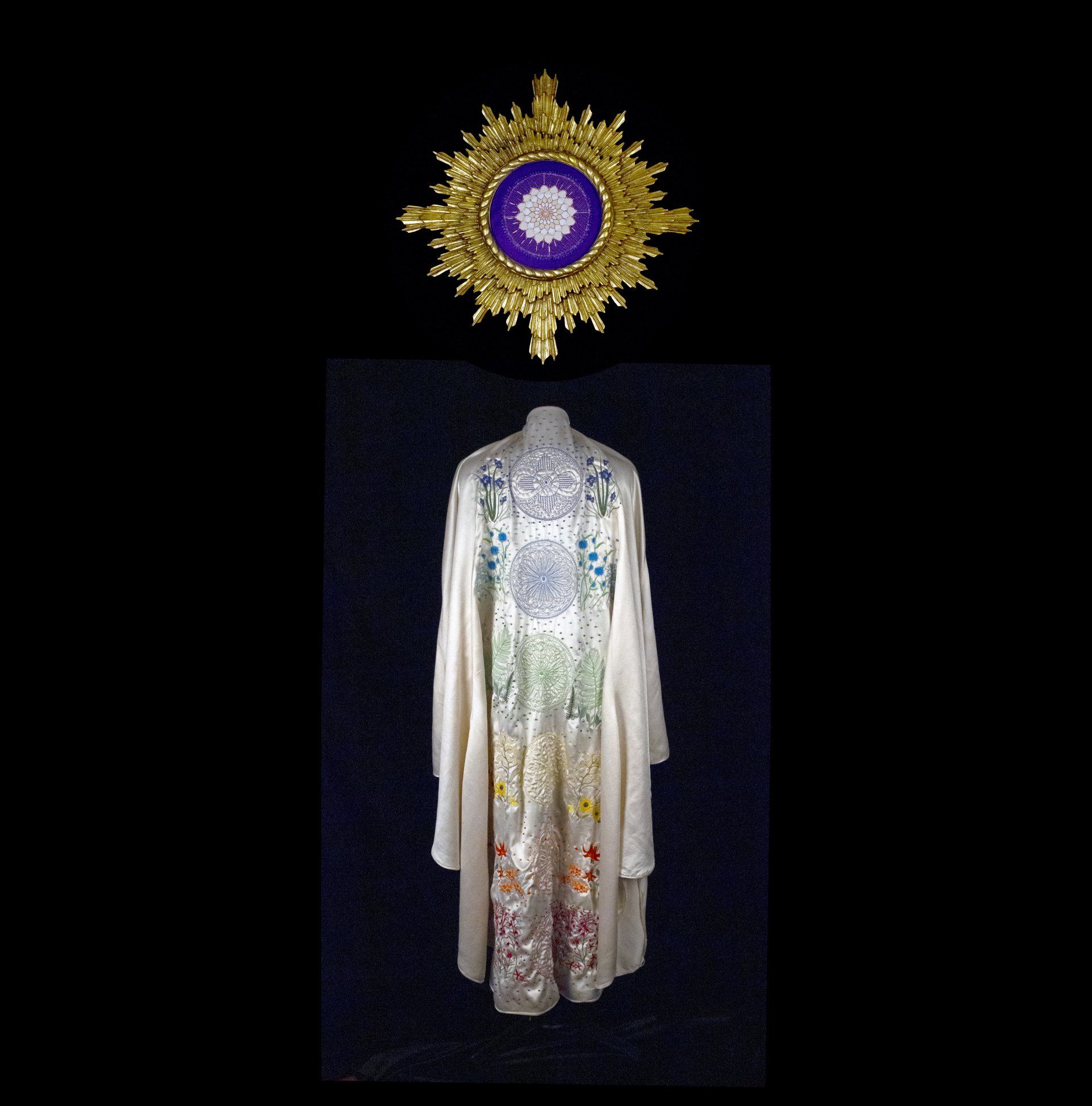 A buttery vintage satin cloak supports high stitch density machine embroideries of Virginia wildflowers and the rainbow-colored human energy system of the chakras. The core structural design device of the six chakras on the cloak is the infinity symbol. Glass beads surround the chakras and the wildflowers. Above the cloak floats an ornately framed 7th crown chakra.