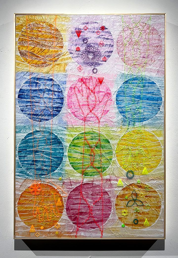 Expanded Reach, the largest single work in this exhibition, carries a long and winding process history. It began with stitched tissue paper applied to board, a surface both fragile and strong. Onto this, I painted twelve circles to represent the expanded chakra system.