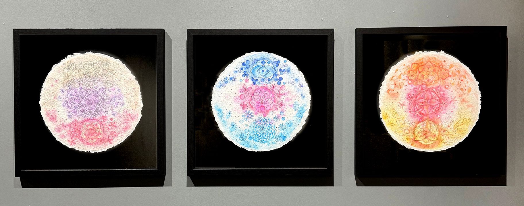 Each rondo begins with watercolor, the first breath of energy. The thread follows, grounding the form, before paint returns to merge pigment and fiber into a living field. The circle mirrors the cycles I feel in meditation—expansion, contraction, and renewal.