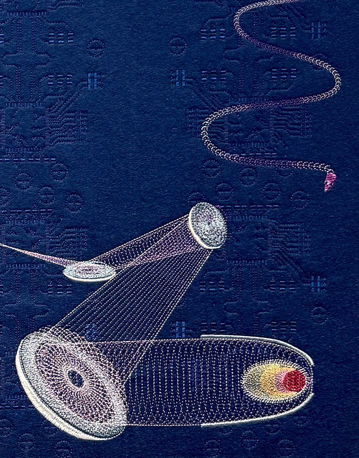 Created in 2024, Extreme Ultraviolet Lithography documents the highly complex process used to make computer chips for quantum computing. This embroidered work was featured in my exhibition Machine Memory and Motherboards at Artspace, Richmond, VA and A.I.R. Gallery, Brooklyn, NY.
